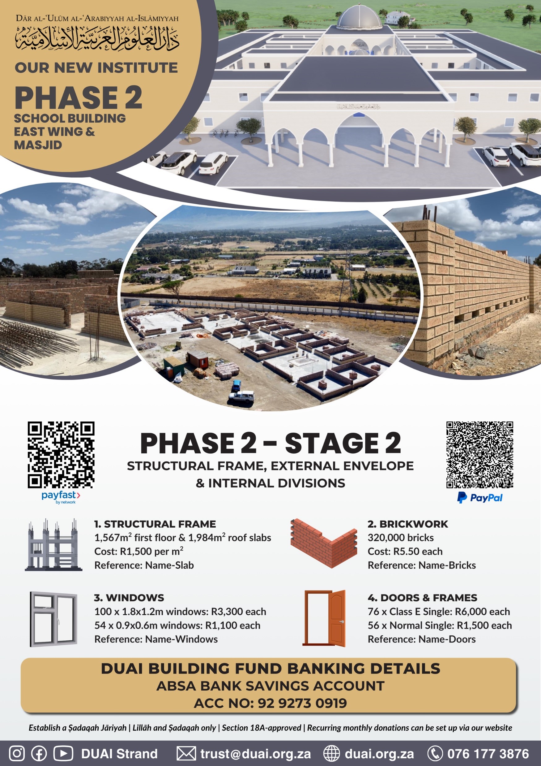 We have now progressed to Phase 2, which comprises the construction of the East Wing of the School Building and will be able to accommodate our current student body. We have also broken ground on the Masjid (Phase 3).